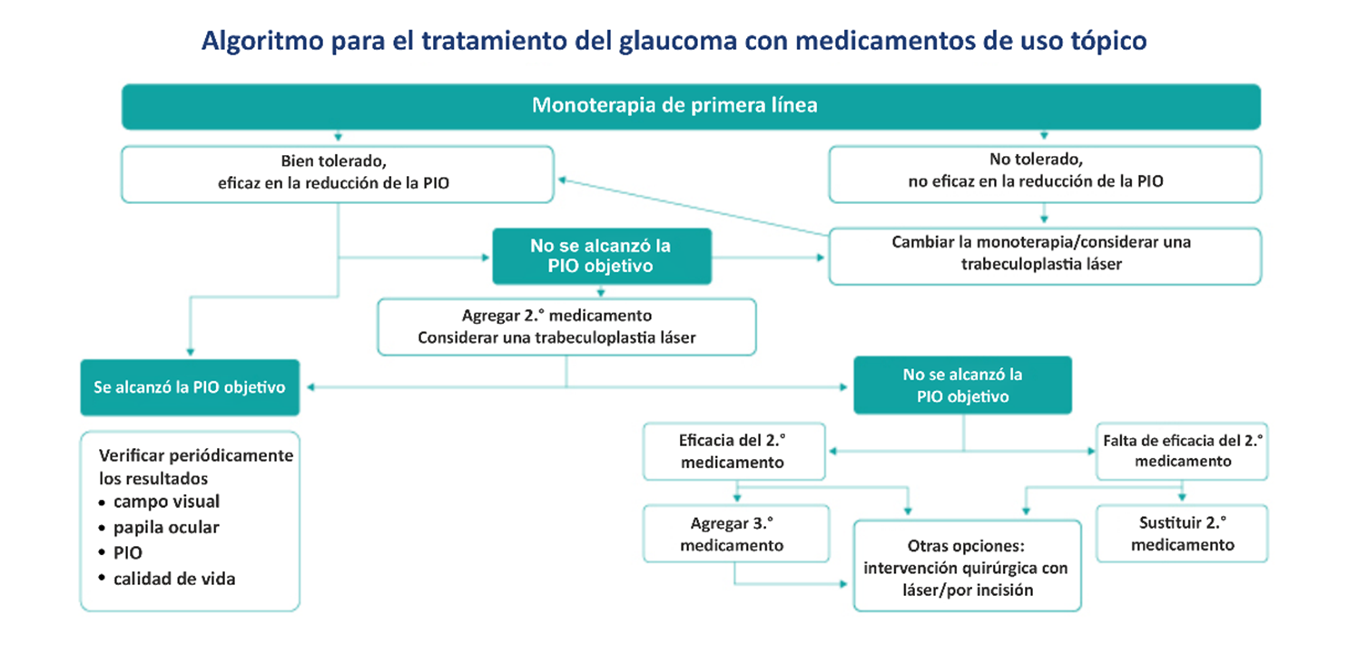 La Sociedad Europea de Glaucoma recomienda el siguiente algoritmo de tratamiento terapéutico para el tratamiento del glaucoma con medicamentos de uso tópico. (En la imagen 2, se presenta el algoritmo de tratamiento).